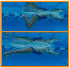 caderas estarán cerca de la superficie del agua al igual que las piernas, juntas, en extensión y con los pies en flexión plantar. La cabeza se mantiene sumergida e inclinada hacia adelante.